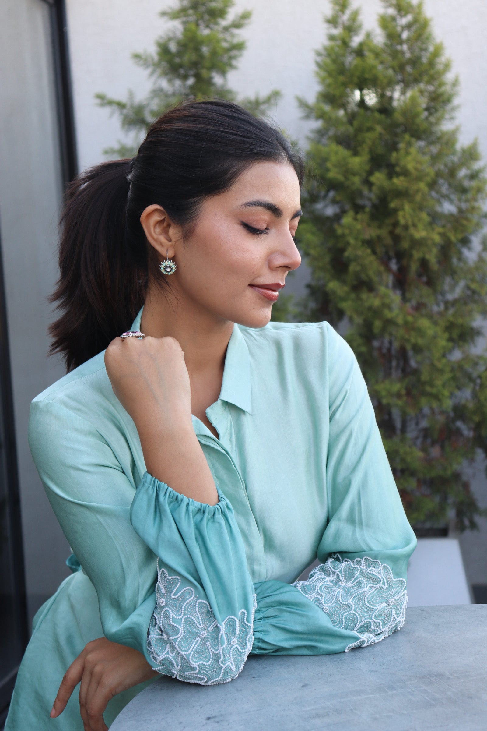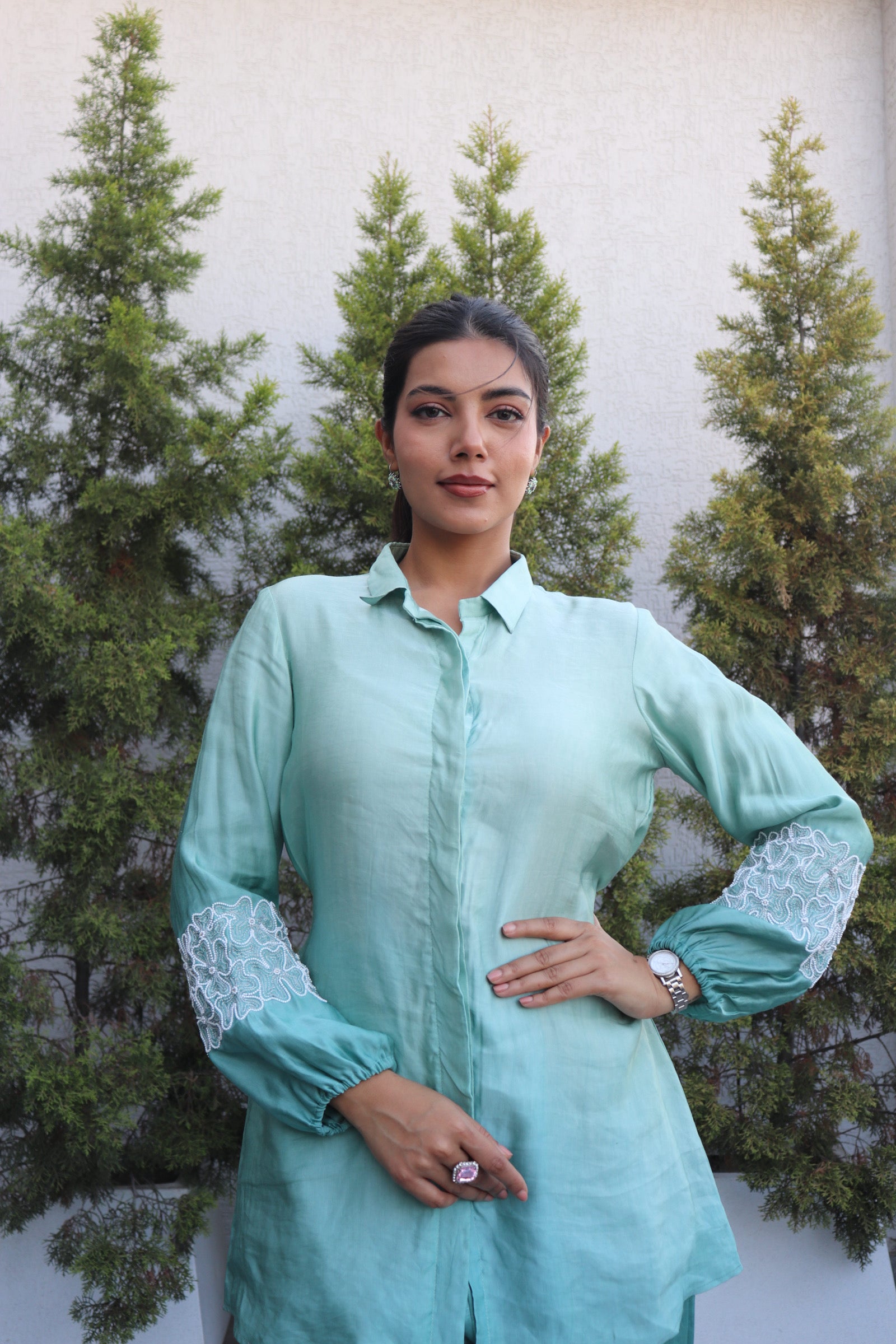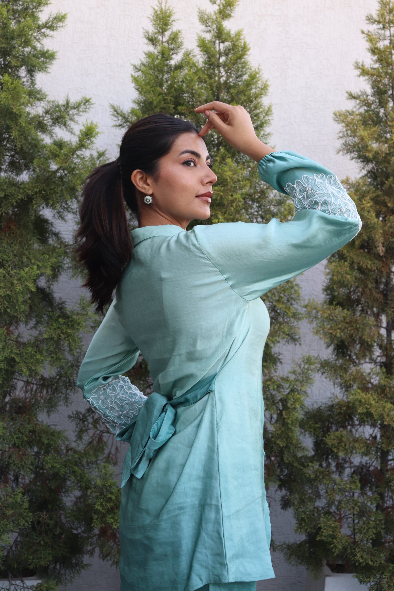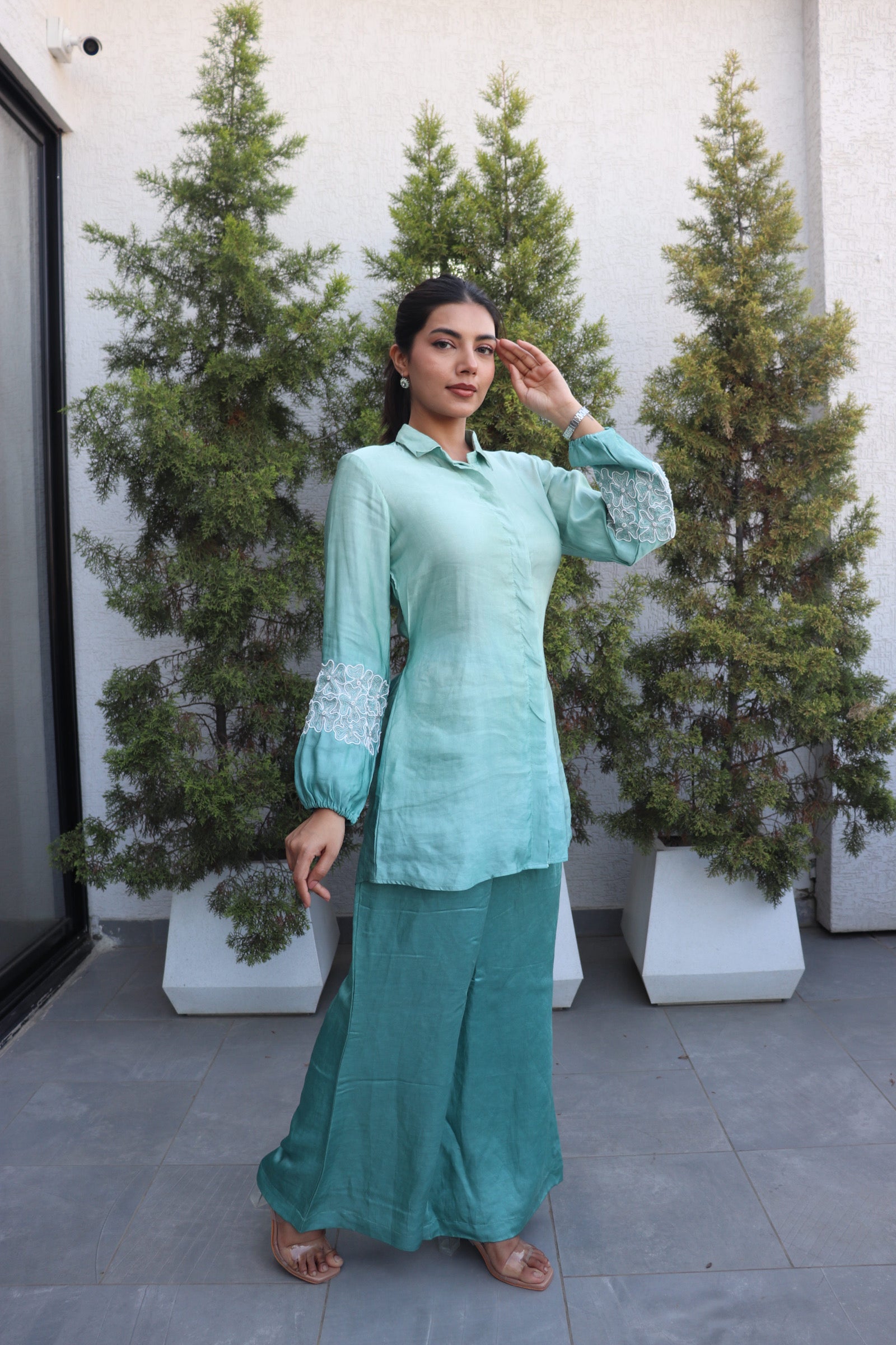 Refresh your style with our Floral Puff Sleeves Shaded Coord Set in elegant Seagreen linen satin. Featuring soft hues and feminine details, this trendy Indo-Western coord is perfect for daytime celebrations or festive gatherings. Made to order for a flawless fit. Dry clean only.